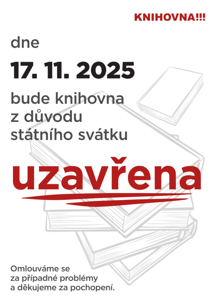 V pondělí 17. 11. 2025 bude knihovna z důvodu státního svátku uzavřena. Omlouváme se za případné problémy a děkujeme za pochopení.
