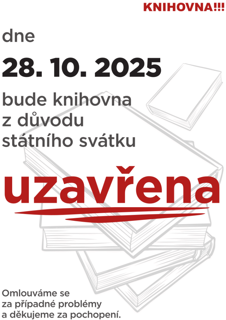 Dne 28. 10. 2025 bude knihovna z důvodu státního svátku uzavřena. Omlouváme se za případné problémy a děkujeme za pochopení.