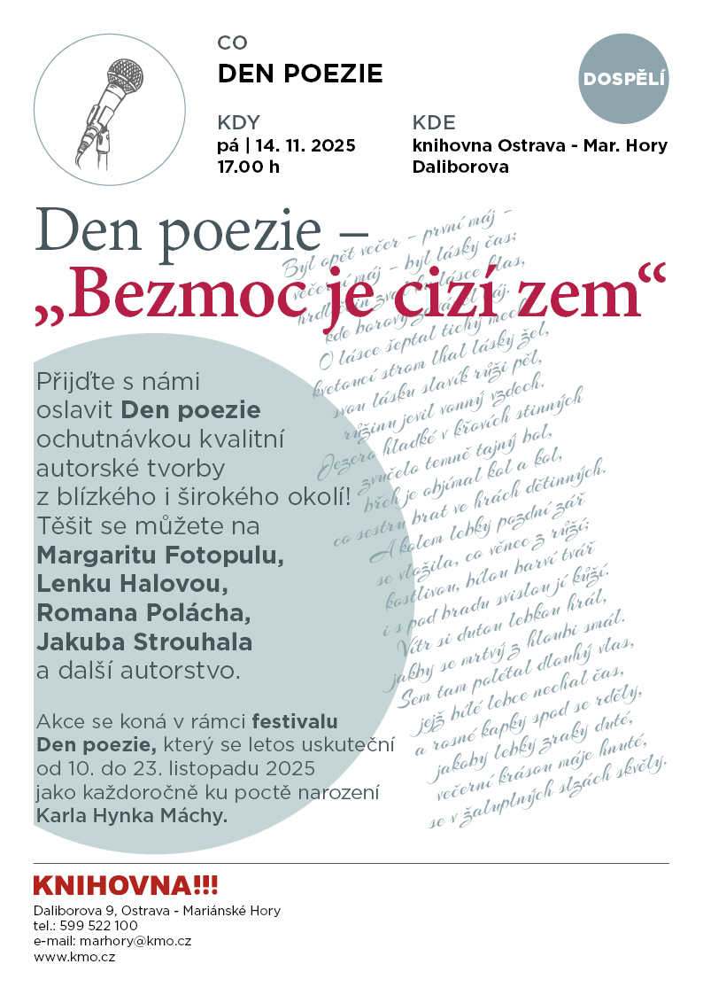 a další autorstvo. Akce se koná v rámci festivalu Den poezie, který se letos uskuteční od 10. do 23. listopadu 2025 jako každoročně ku poctě narození Karla Hynka Máchy.