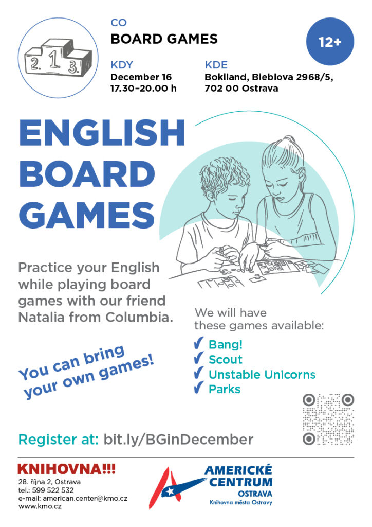 Due to the planned reconstruction, the Central Library building is currently closed. In the meantime, our club meetings will continue at Bokiland board games store, Bieblova 2968/5, 702 00 Moravská Ostrava a Přívoz, located near the Důl Jindřich tram stop (a twenty-minute walk from the library).