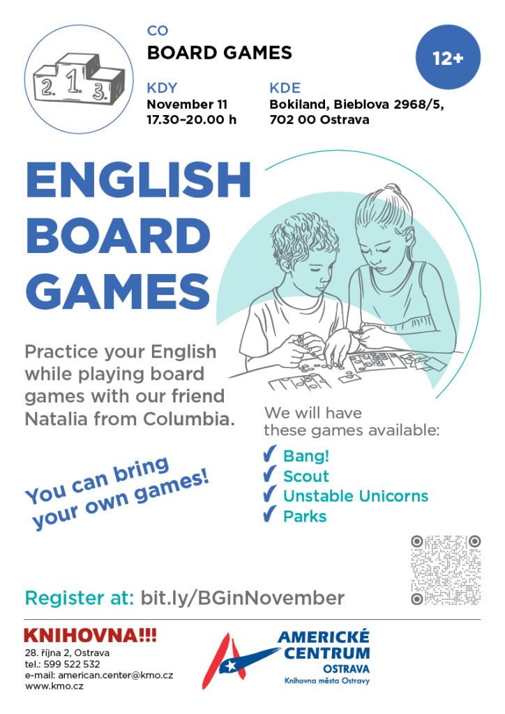 Due to the planned reconstruction, the Central Library building is currently closed. In the meantime, our club meetings will continue at Bokiland board games store, Bieblova 2968/5, 702 00 Moravská Ostrava a Přívoz, located near the Důl Jindřich tram stop (a twenty-minute walk from the library).