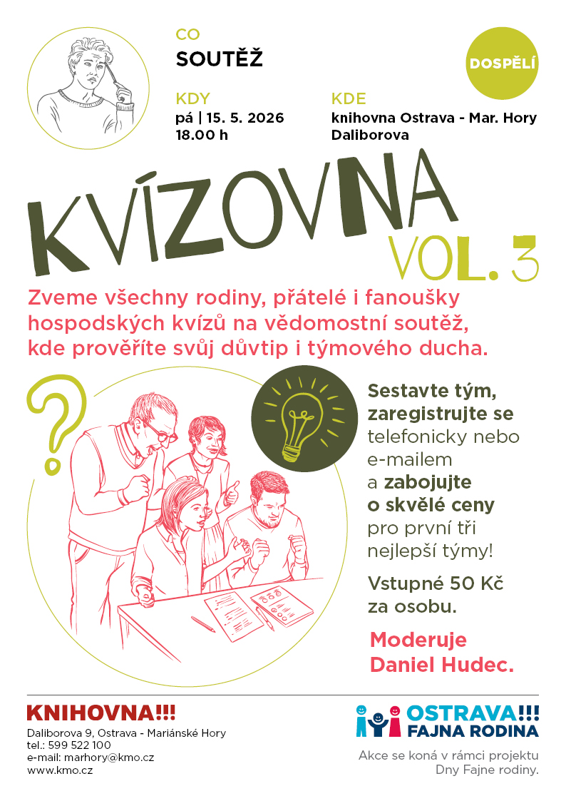 Zveme všechny rodiny, přátelé i fanoušky hospodských kvízů na vědomostní soutěž, kde prověříte svůj důvtip i týmového ducha. Sestavte tým, zaregistrujte se telefonicky nebo e-mailem a zabojujte o skvělé ceny pro první tři nejlepší týmy! Vstupné 50 Kč za osobu. Moderuje Daniel Hudec. Akce se koná v rámci Dnů fajne rodiny.