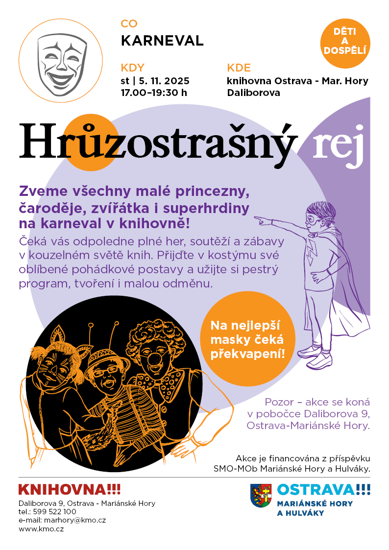 Zveme všechny malé princezny, čaroděje, zvířátka i superhrdiny na karneval v knihovně! Čeká vás odpoledne plné her, soutěží a zábavy v kouzelném světě knih. Přijďte v kostýmu své oblíbené pohádkové postavy a užijte si pestrý program, tvoření i malou odměnu. Na nejlepší masky čeká překvapení! Pozor – akce se koná v pobočce Daliborova 9, Ostrava-Mariánské Hory ve středu 5. 11. 2025 od 17.00 do 19.30 hodin.   Akce je financována z příspěvku SMO-MOb Mariánské Hory a Hulváky.