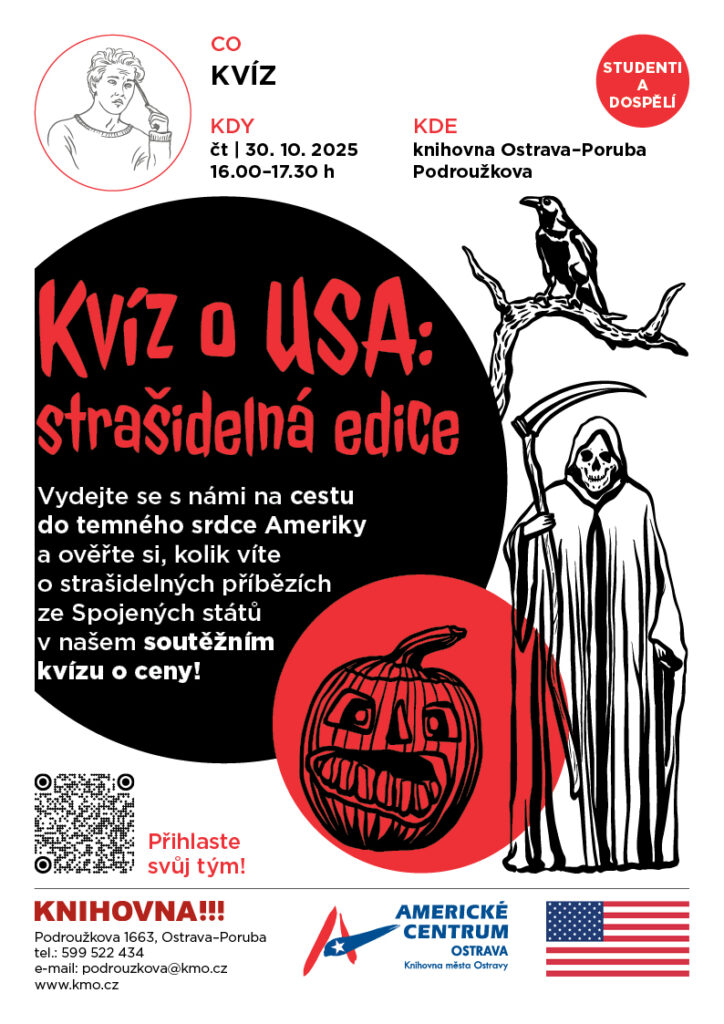 Americké centrum Vás srdečně zve na českojazyčný kvíz o strašidelných příbězích a tradicích ze Spojených států. Přijďte otestovat své znalosti v soutěžním kvízu o ceny!