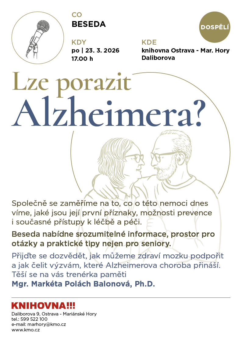 Společně se zaměříme na to, co o této nemoci dnes víme, jaké jsou její první příznaky, možnosti prevence i současné přístupy k léčbě a péči. Beseda nabídne srozumitelné informace, prostor pro