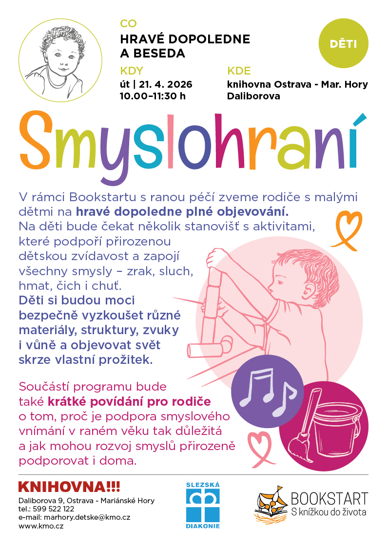 V rámci Bookstartu s ranou péčí zveme rodiče s malými dětmi na hravé dopoledne plné objevování. Na děti bude čekat několik stanovišť s aktivitami, které podpoří přirozenou dětskou zvídavost a zapojí všechny smysly – zrak, sluch, hmat, čich i chuť. Děti si budou moci bezpečně vyzkoušet různé materiály, struktury, zvuky i vůně a objevovat svět skrze vlastní prožitek. Součástí programu bude také krátké povídání pro rodiče o tom, proč je podpora smyslového vnímání v raném věku tak důležitá a jak mohou rozvoj smyslů přirozeně podporovat i doma.