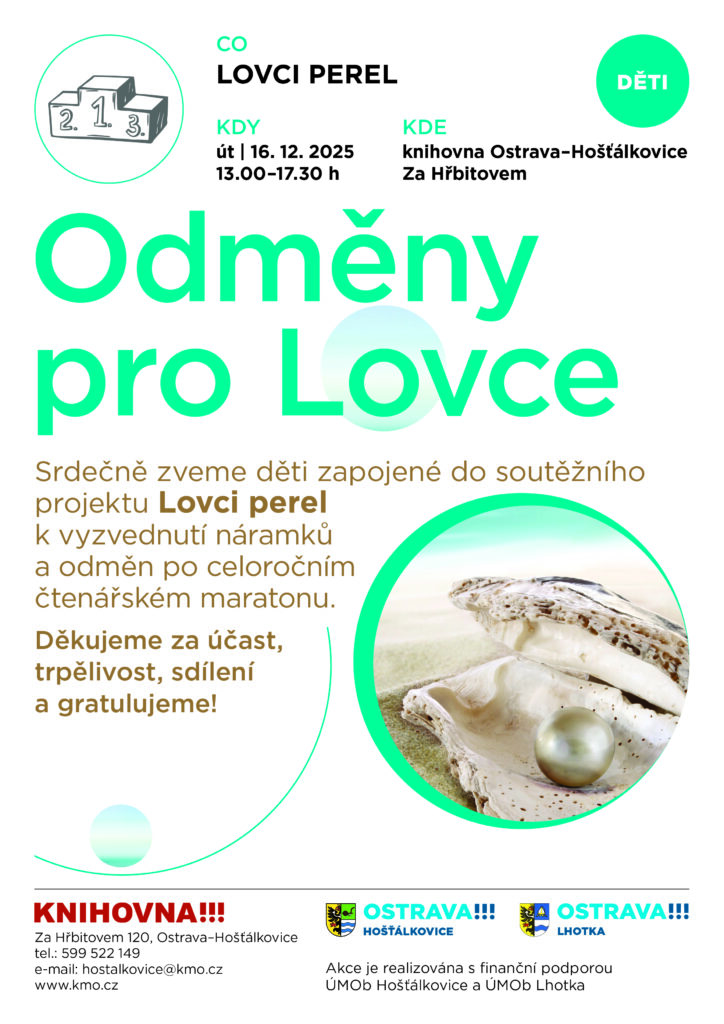 Srdečně zveme děti zapojené do projektu Lovci perel k vyzvednutí náramků a zasloužených odměn po celoročním čtenářském maratonu.