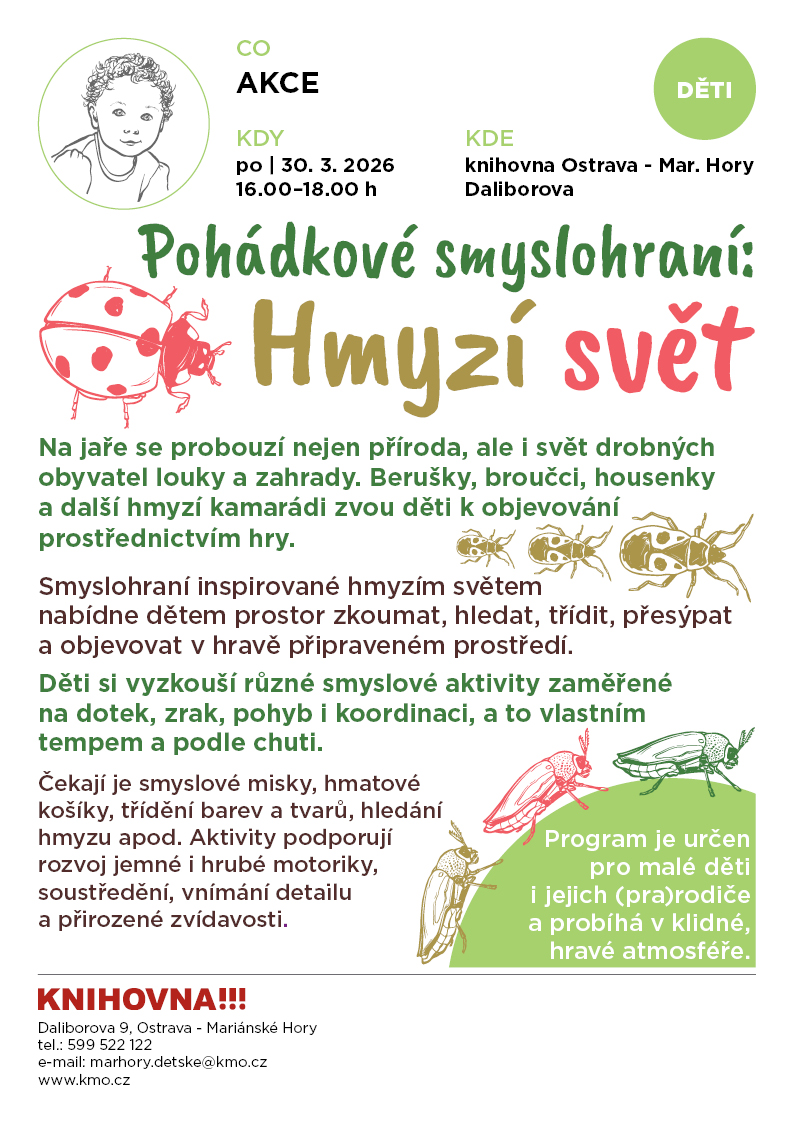 Smyslohraní inspirované hmyzím světem nabídne dětem prostor zkoumat, hledat, třídit, přesýpat a objevovat v hravě připraveném prostředí. Děti si vyzkouší různé smyslové aktivity zaměřené