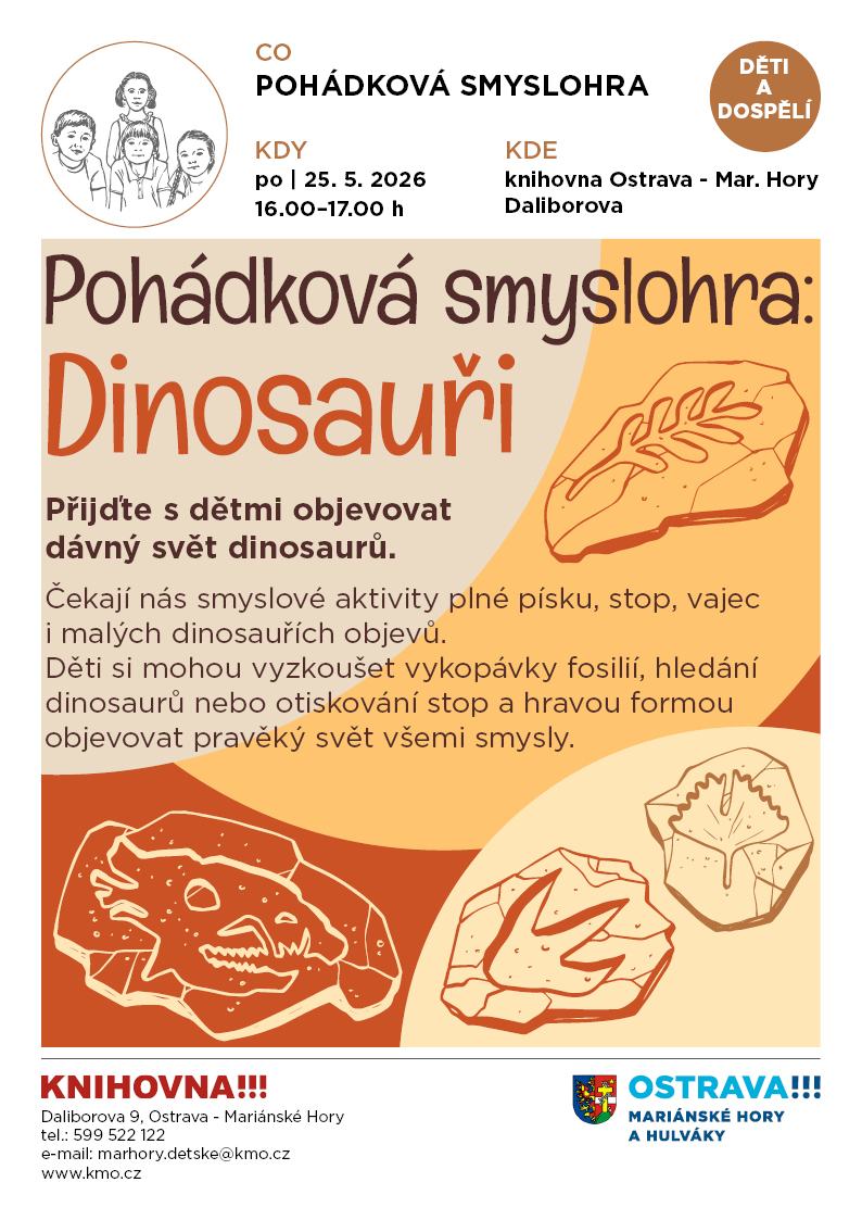Přijďte s dětmi objevovat dávný svět dinosaurů. Čekají nás smyslové aktivity plné písku, stop, vajec i malých dinosauřích objevů. Děti si mohou vyzkoušet vykopávky fosilií, hledání dinosaurů nebo otiskování stop a hravou formou objevovat pravěký svět všemi smysly.