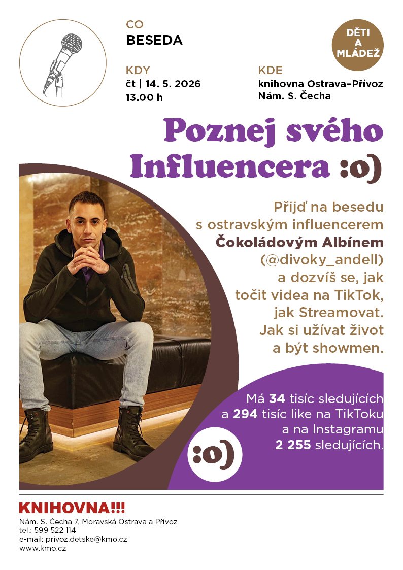 Přijď na besedu s ostravským influencerem Čokoládovým Albínem (@divoky_andell) a dozvíš se, jak točit videa na TikTok, jak Streamovat. Jak si užívat život a být showmen. Má 34 tisích sledujících a 294 tisíc like na TikToku a na Instagramu 2 255 sledujících. :o)