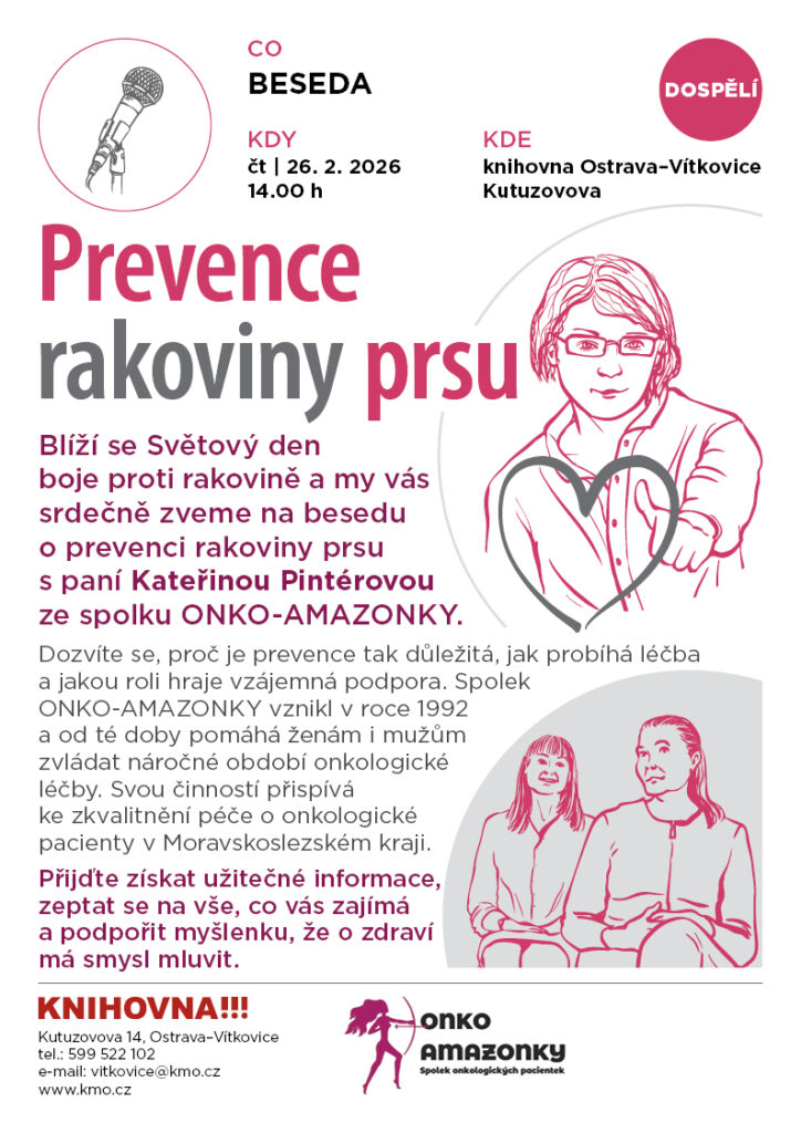 Blíží se Světový den boje proti rakovině a my vás srdečně zveme na besedu o prevenci rakoviny prsu s paní Kateřinou Pintérovou ze spolku ONKO-AMAZONKY. Dozvíte se, proč je prevence tak důležitá, jak probíhá léčba a jakou roli hraje vzájemná podpora. Spolek ONKO-AMAZONKY vznikl v roce 1992 a od té doby pomáhá ženám i mužům zvládat náročné období onkologické léčby. Svou činností přispívá ke zkvalitnění péče o onkologické pacienty v Moravskoslezském kraji. Přijďte získat užitečné informace, zeptat se na vše, co vás zajímá a podpořit myšlenku, že o zdraví má smysl mluvit.
