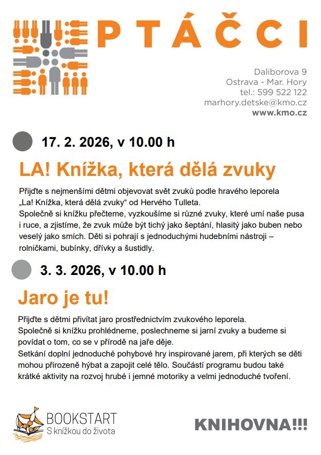 Přijďte s nejmenšími dětmi objevovat svět zvuků podle hravého leporela „La! Knížka, která dělá zvuky“ od Hervého Tulleta. Společně si knížku přečteme, vyzkoušíme si různé zvuky, které umí naše pusa i ruce, a zjistíme, že zvuk může být tichý jako šeptání, hlasitý jako buben nebo veselý jako smích. Děti si pohrají s jednoduchými hudebními nástroji – rolničkami, bubínky, dřívky a šustidly.