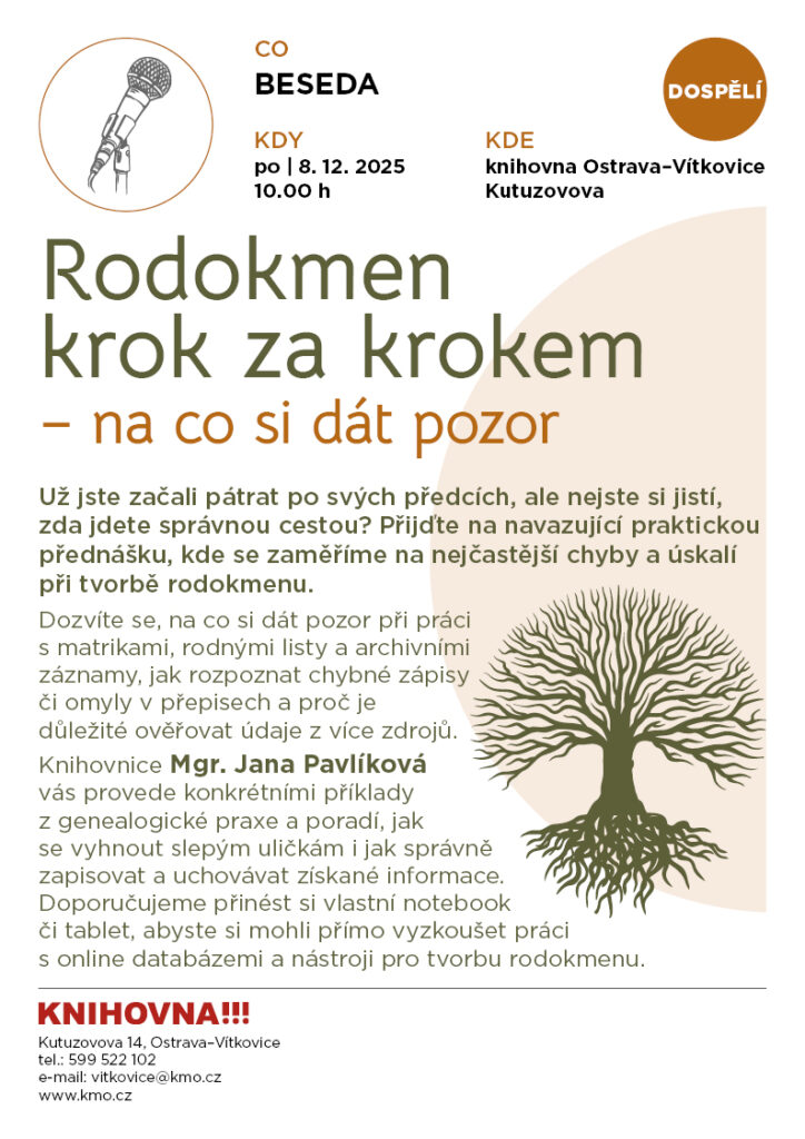Už jste začali pátrat po svých předcích, ale nejste si jistí, zda jdete správnou cestou? Přijďte na navazující praktickou přednášku, kde se zaměříme na nejčastější chyby a úskalí při tvorbě rodokmenu. Dozvíte se, na co si dát pozor při práci s matrikami, rodnými listy a archivními záznamy, jak rozpoznat chybné zápisy či omyly v přepisech a proč je důležité ověřovat údaje z více zdrojů. Knihovnice Mgr. Jana Pavlíková vás provede konkrétními příklady z genealogické praxe a poradí, jak se vyhnout slepým uličkám i jak správně zapisovat a uchovávat získané informace.