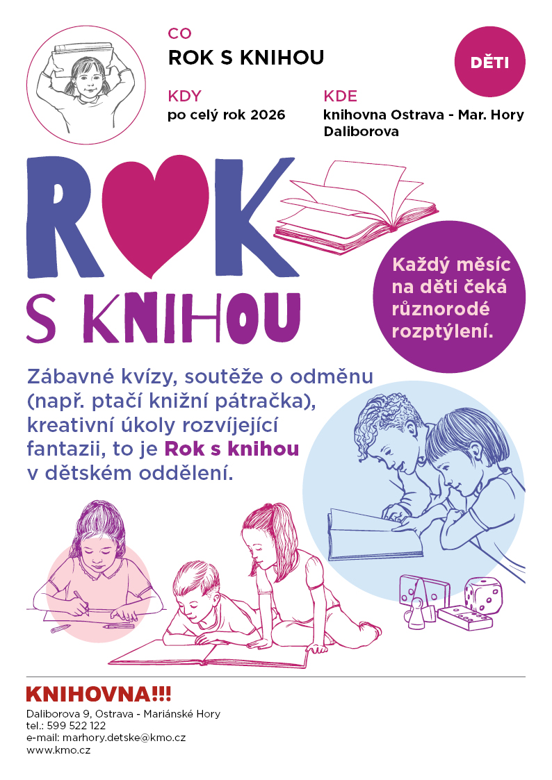 Zábavné kvízy, soutěže o odměnu (např. ptačí knižní pátračka), kreativní úkoly rozvíjející fantazii, to je Rok s knihou v dětském oddělení. Každý měsíc na děti čeká různorodé rozptýlení.