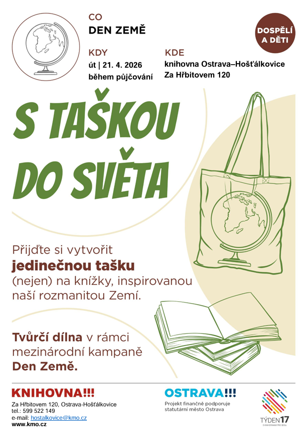 Přijďte si vytvořit jedinečnou tašku (nejen) na knížky, inspirovanou naší rozmanitou Zemí. Tvůrčí dílna v rámci mezinárodní kampaně Den Země. Srdečně zveme děti i dospělé.