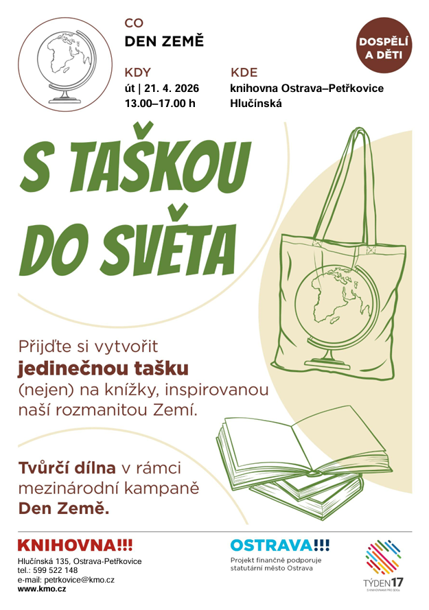 Přijďte si vytvořit jedinečnou tašku (nejen) na knížky, inspirovanou naší rozmanitou Zemí - v pobočce Petřkovice v úterý 21. 4. 2026 od 13 do 17 hodin.
