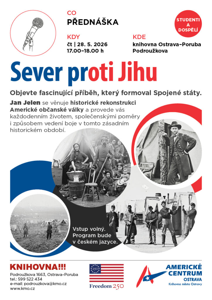 Objevte fascinující příběh, který formoval Spojené státy. Jan Jelen se věnuje historické rekonstrukci Americké občanské války a provede Vás každodenním životem, společenskými poměry i způsobem vedení boje v tomto zásadním historickém období. Vstup volný. Program bude v českém jazyce.