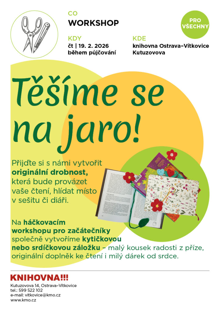 Přijďte si s námi vytvořit originální drobnost, která bude provázet vaše čtení, hlídat místo v sešitu či diáři. Na háčkovacím workshopu pro začátečníky společně vytvoříme kytičkovou nebo srdíčkovou záložku – malý kousek radosti z příze, originální doplněk ke čtení i milý dárek od srdce.