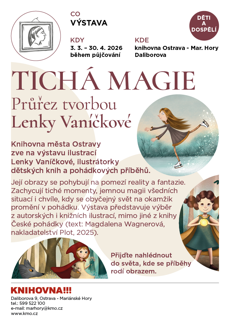 Knihovna města Ostravy zve na výstavu ilustrací Lenky Vaníčkové, ilustrátorky dětských knih a pohádkových příběhů. Její obrazy se pohybují na pomezí reality a fantazie. Zachycují tiché momenty, jemnou magii všedních situací i chvíle, kdy se obyčejný svět na okamžik promění v pohádku. Výstava představuje výběr z autorských i knižních ilustrací, mimo jiné z knihy České pohádky (text: Magdalena Wagnerová, nakladatelství Plot, 2025). Přijďte nahlédnout do světa, kde se příběhy rodí obrazem.