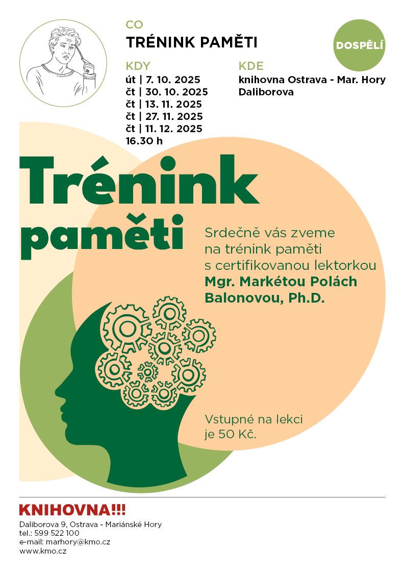 Srdečně vás zveme na trénink paměti s certifikovanou lektorkou Mgr. Markétou Polách Balonovou, Ph.D. Vstupné na lekci je 50 Kč. Sejdeme se v těchto termínech: úterý 7. 10. 2025 a čtvrtky 30. 10. 2025, 13. 11. 2025, 27. 11. 2025 a 11. 12. 2025 v 16.30 hodin.