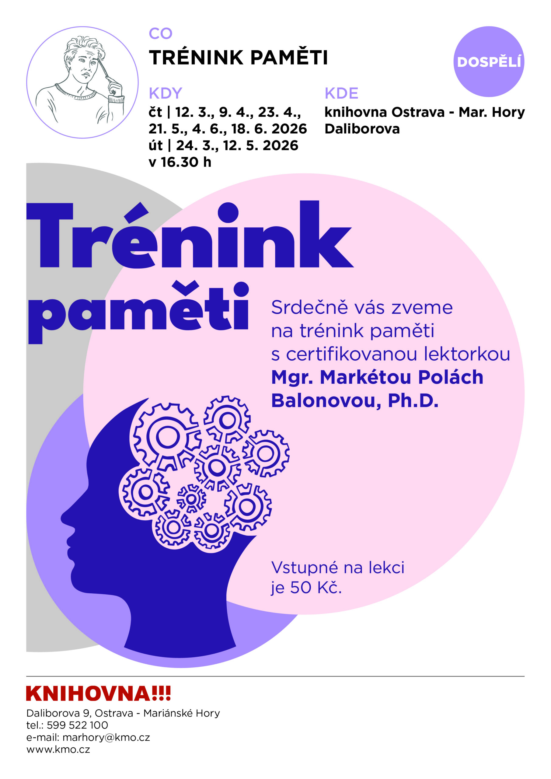 Srdečně vás zveme na trénink paměti s certifikovanou lektorkou Mgr. Markétou Polách Balonovou, Ph.D. Vstupné na lekci je 50 Kč.
