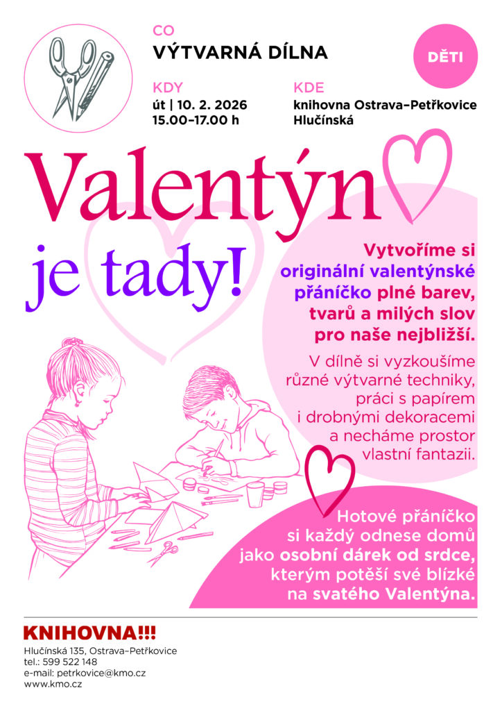 Vytvoříme si originální valentýnské přáníčko plné barev, tvarů a milých slov pro naše nejbližší. V dílně si vyzkoušíme různé výtvarné techniky, práci s papírem i drobnými dekoracemi a necháme prostor vlastní fantazii. Hotové přáníčko si každý odnese domů jako osobní dárek od srdce, kterým potěší své blízké na svatého Valentýna.