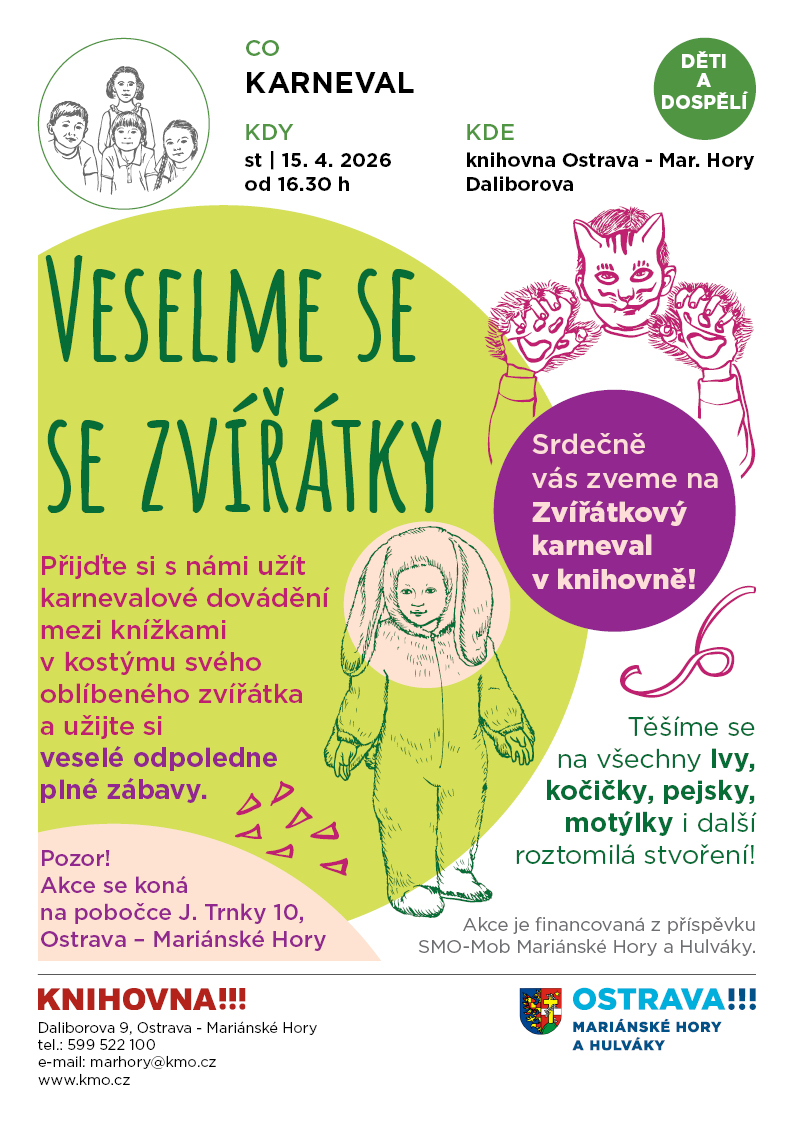 Přijďte si s námi užít karnevalové dovádění mezi knížkami v kostýmu svého oblíbeného zvířátka a užijte si veselé odpoledne plné zábavy. Těšíme se na všechny lvy, kočičky, pejsky, motýlky i další roztomilá stvoření!