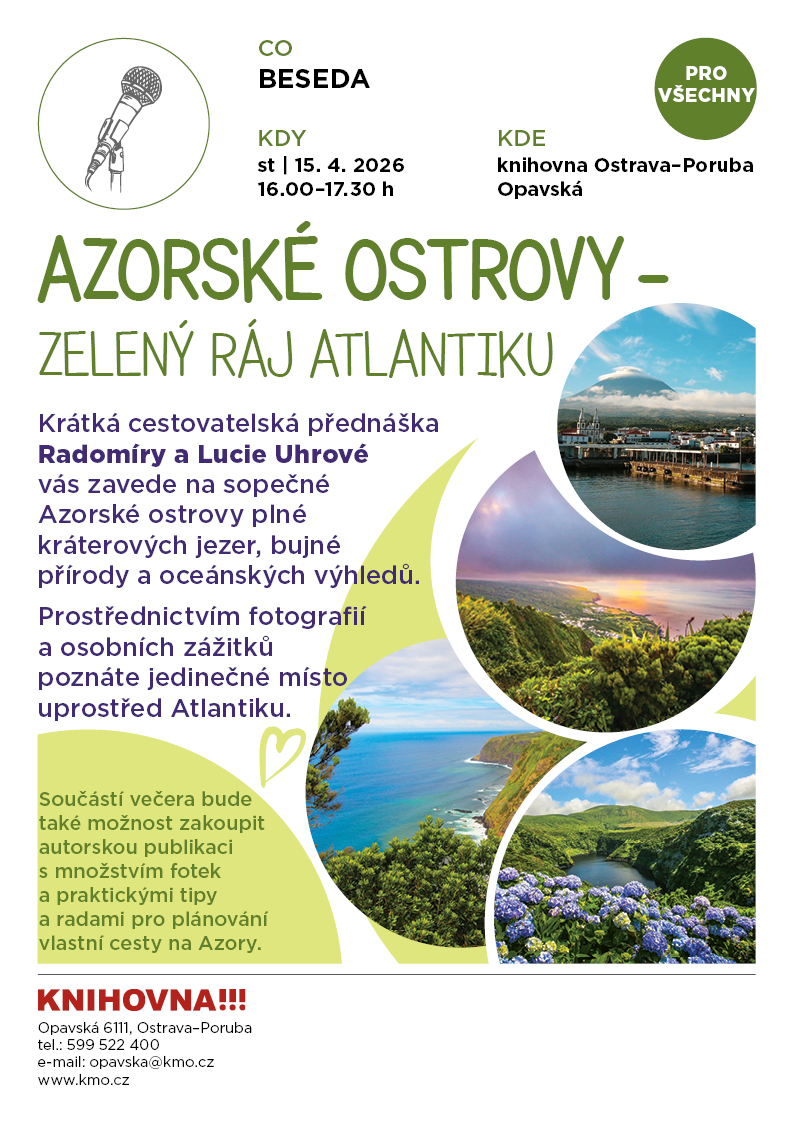 Dále Vás 15. 4. 2026 srdečně zveme na cestovatelskou besedu Azorské ostrovy s paní Radomírou a Lucií Uhrovou, začátek je v 16.00h.
